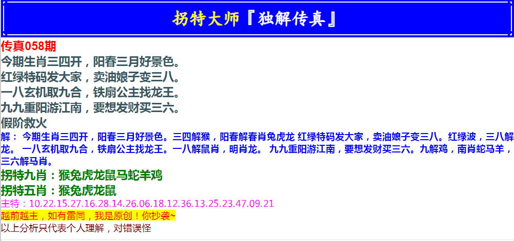 058期拐特大师澳门传真[图]