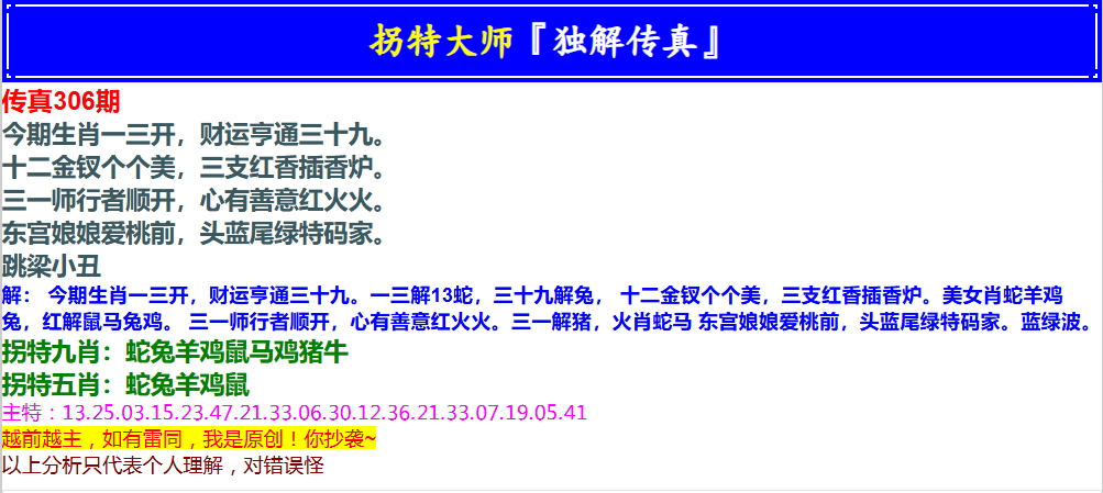 306期拐特大师澳门传真[图]